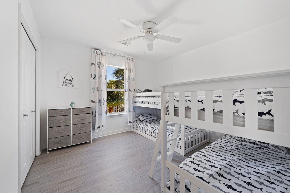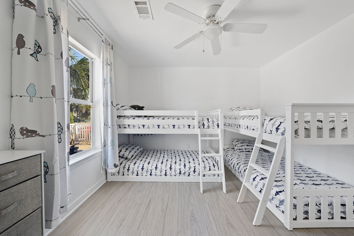 ☀ 3 spacious bedrooms; 1 king, 1 queen, 2 bunk beds (4 beds), crib + air mattress also available