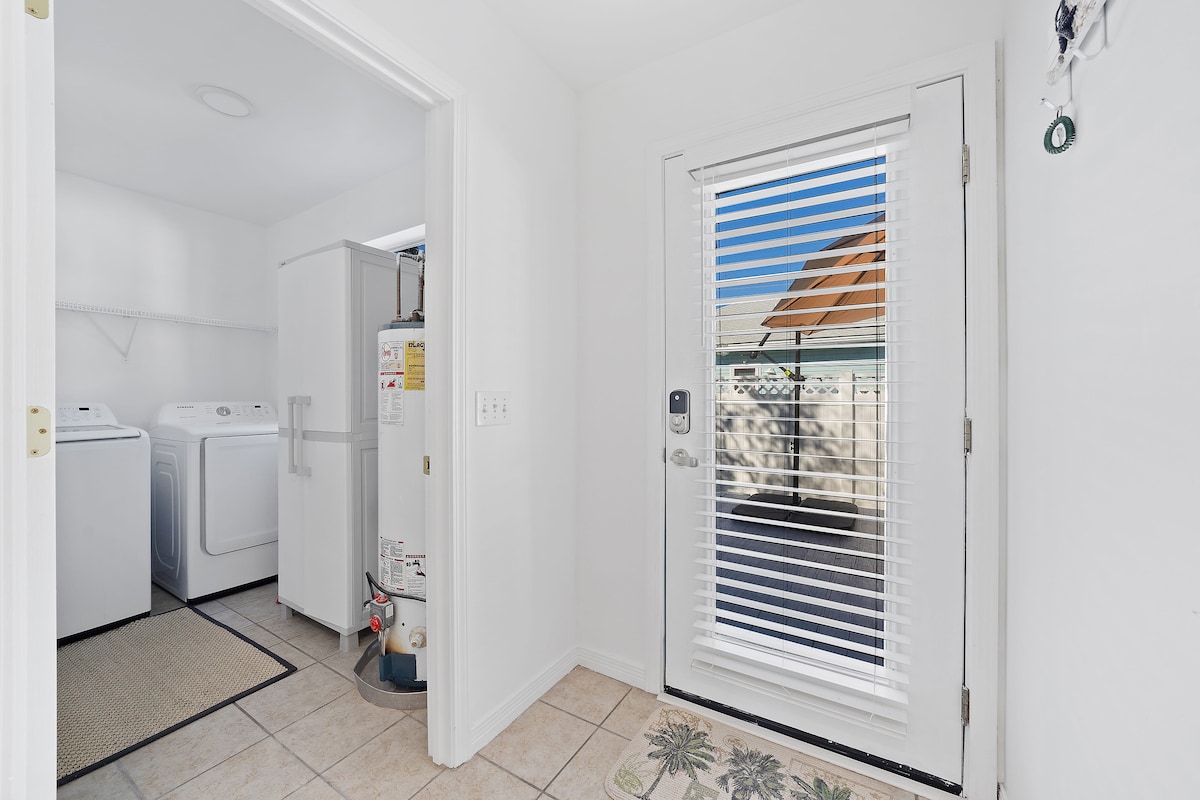 The laundry room features a new Samsung washer & dryer with detergent along with an iron + ironing board.