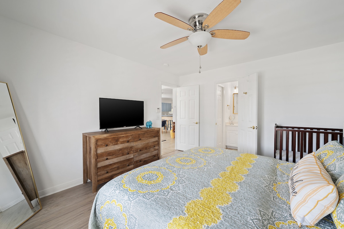 The first bedroom features a luxurious king-size bed, a crib for young children, and a 4K Smart TV for your entertainment. This room also has a private bathroom with a shower and tub combination.