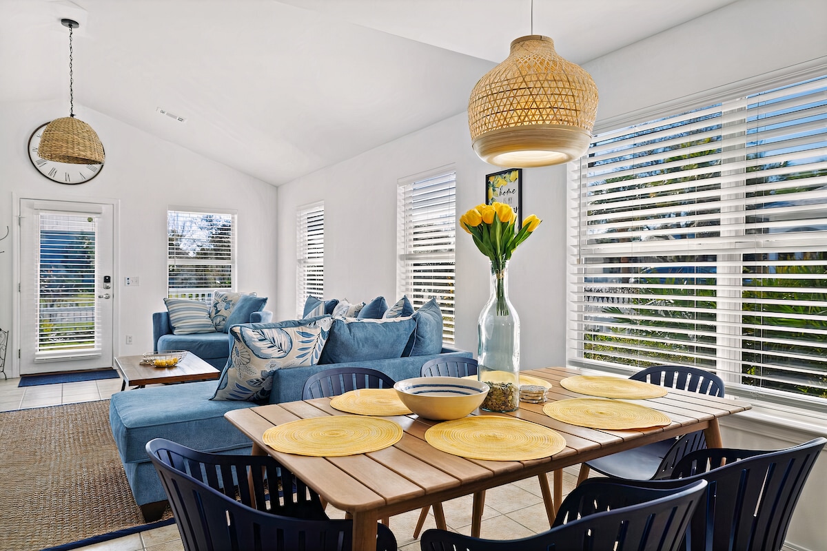 You can stay entertained in the living room, decorated with a nautical-inspired theme and designed to be open and airy to match the home’s beachy locale. Sink into the plush couch in front of the large Smart TV as you relax after a day at the beach or in the private pool, or gather the family to plan another exciting day in Destin.